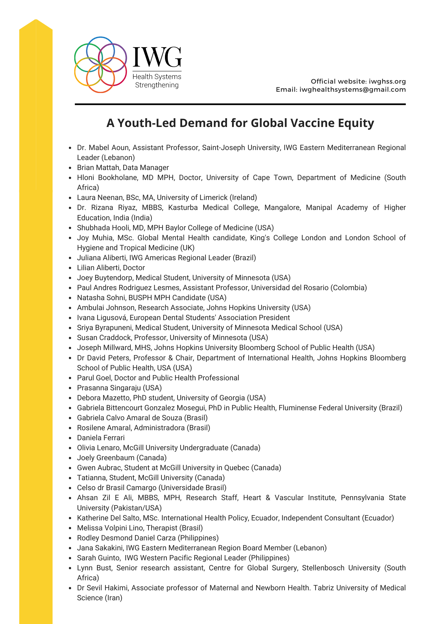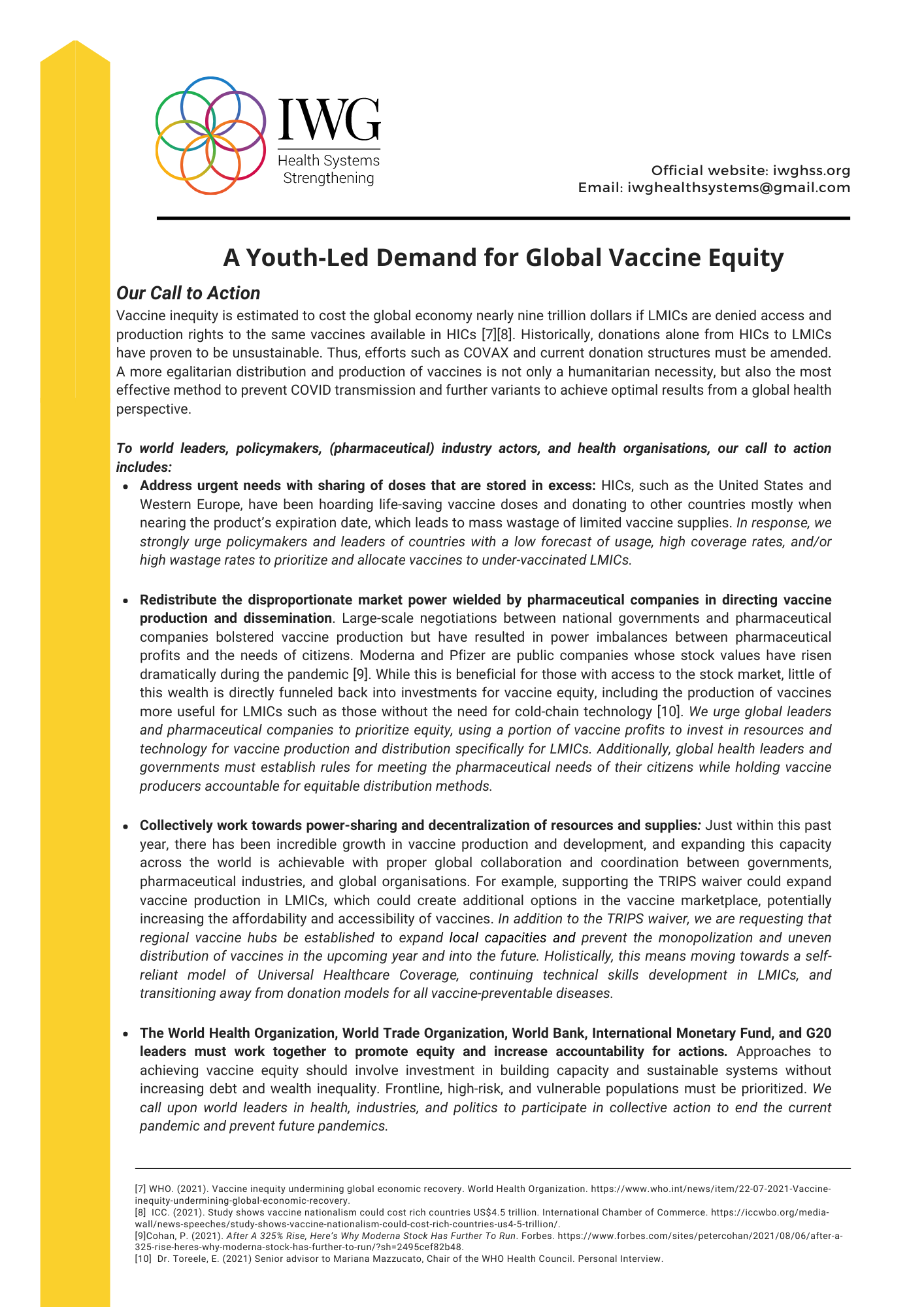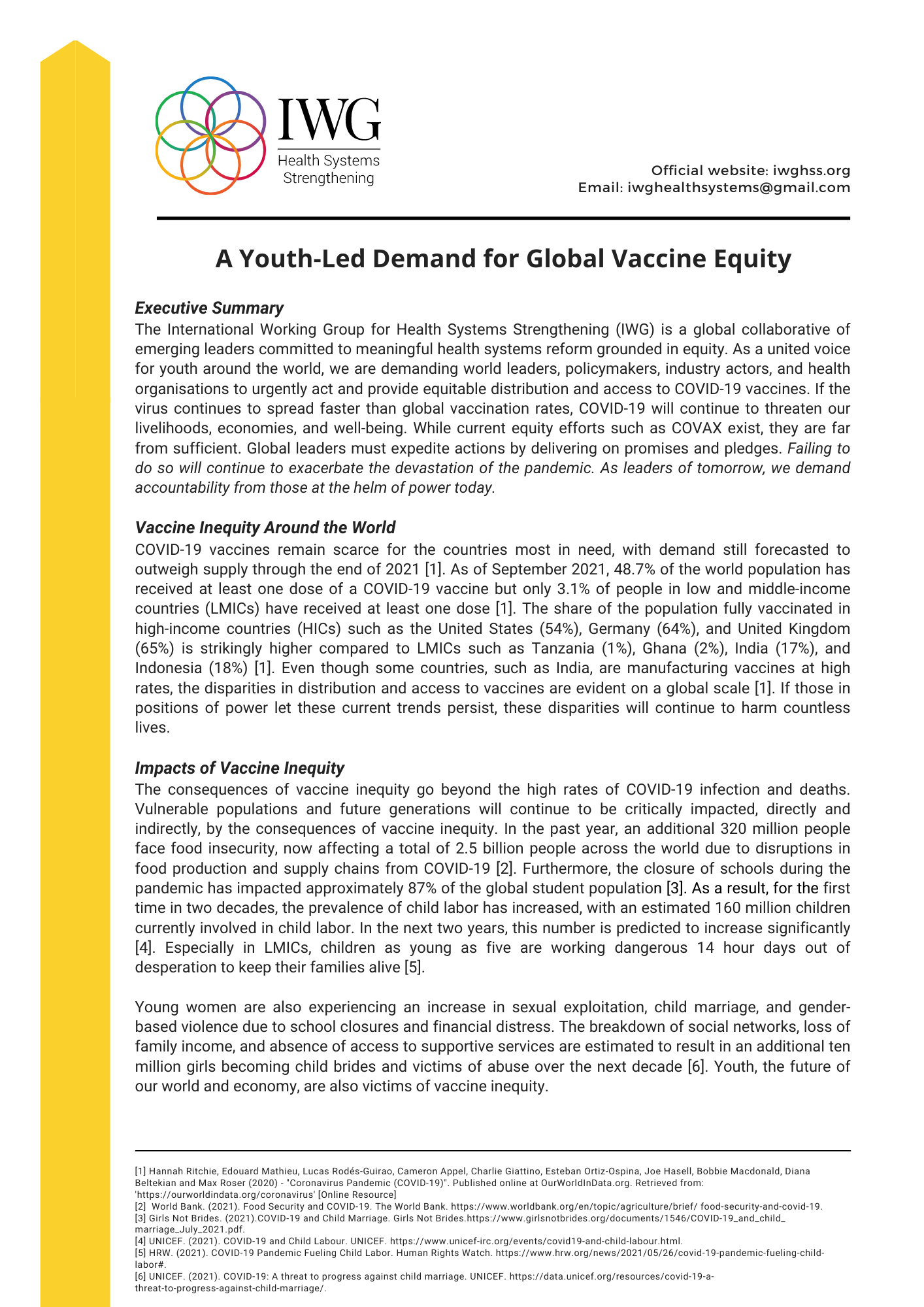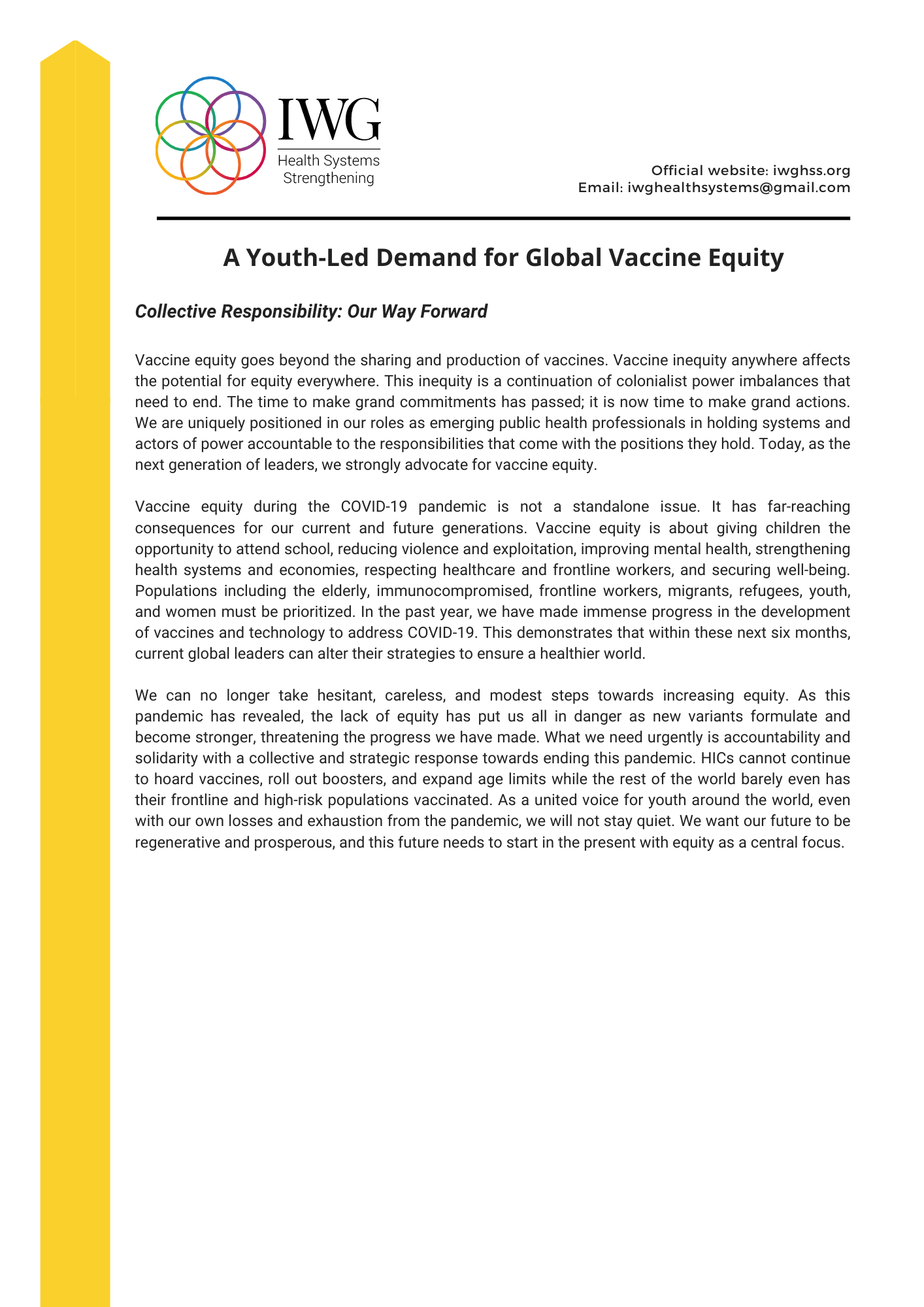 As a network of emerging global public health leaders and professionals, we believe that we are uniquely positioned to demand accountability from leadership and to reinforce the need for equity across global COVID-19 vaccine access and distribution efforts. On October 30, 2021, aligning with the G20 Summit, we published the position paper attached below that uniquely emphasizes our youth-led voice, with demands for new efforts and strategies to increase the distribution and accessibility of COVID-19 vaccines to low and middle-income countries.